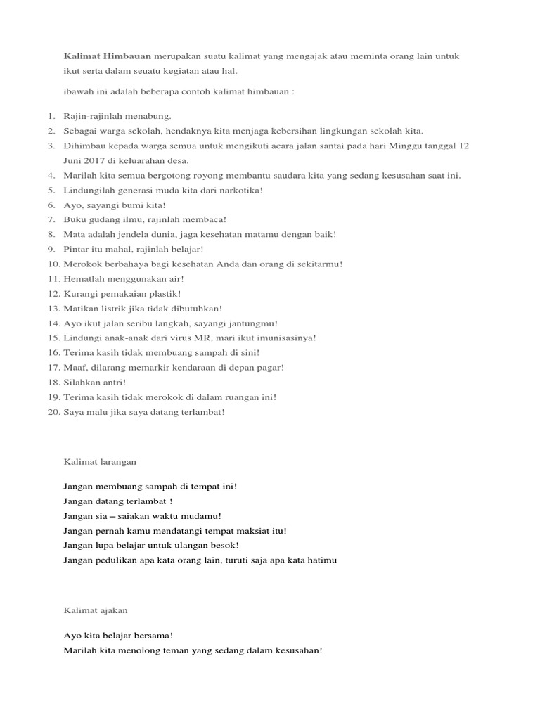 Urutkan kata kata berikut menjadi kalimat. Gabungkan kedua kalimat ini dengan kata hubung dan! Dalam kalimat, kata leksikal berkedudukan sebagai subjek. Buatlah kalimat dengan kata tempat sampah 27486901 jajaran satuan reskrim polres indramayu terus melakukan penyelidikan terkait pecahnya bentrokan antarwarga bentrokan itu melibatkan empat desa di indr. Prohibition adalah kalimat larangan dalam bahasa inggris yakni seperti menggunakan do not/don't dan no. Satu sampah yang kau buang ke tempatnya, akan menyelamatkan seluruh alam semesta. Kalimat persuasif harus disajikan sindah mungkin atau harus ditulis dengan bahasa yang menarik, bahkan dalam penyampaiannya juga tak jarang dengan; Kalimat perintah saran adalah kalimat yang berisikan sebuah perintah tidak wajib atau saran, bisa juga dikatakan sebagai masukan. Sehingga saat ini banjir di perkampungan kami tidak dapat dihindari lagi. Menggunakan kata perintah, contohnya yaitu ambilkan, jangan, tolong. Sampah yang bertebaran akan menjadi sumber penyakit. 40. Adapun maksud dengan kata lain, kalimat simpleks merupakan kalimat yang hanya terdiri dari satu frase atau klausa. Tujuan dari membaca telaah bahasa adalah sebagai berikut: